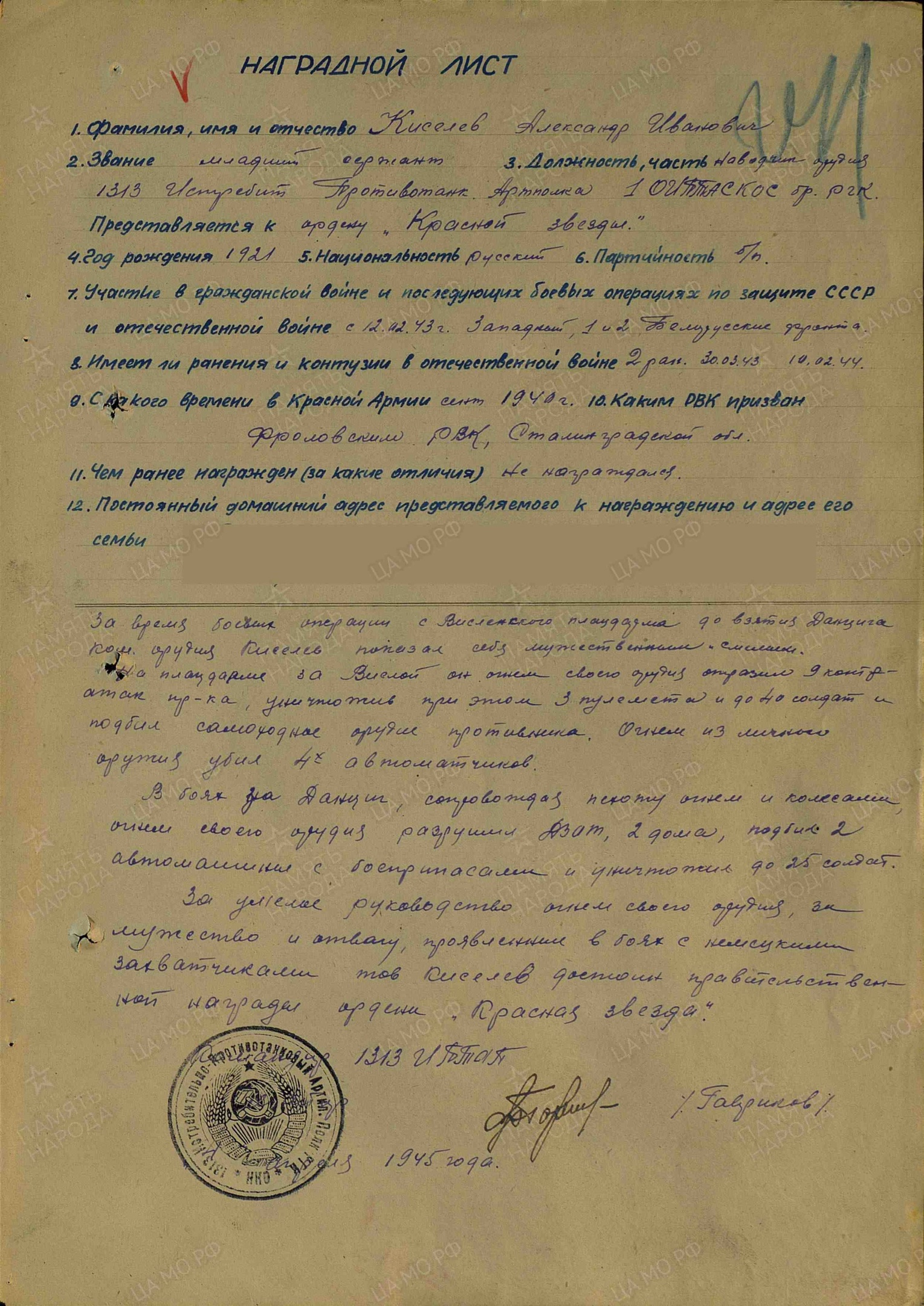 | Киселев Александр Иванович - дед помощника председателя суда Рябовой Светланы Николаевны | версия для печати |